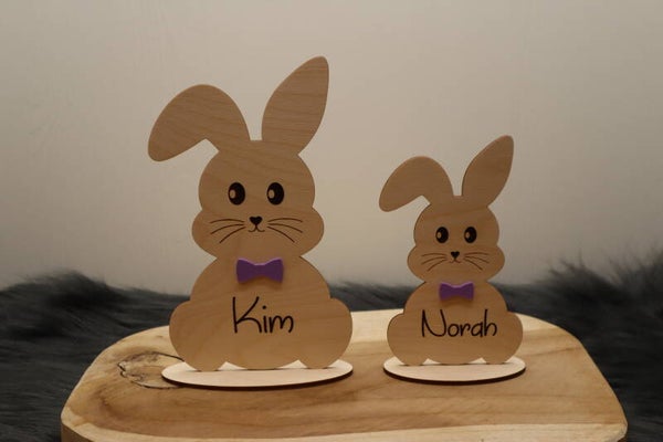 Je kunt kiezen uit verschillende houtkleuren, zodat het konijntje perfect past bij jouw interieur of paasdecoratie. Het strikje is daarnaast ook verkrijgbaar in meerdere kleuren. Ook de naam is beschikbaar in verschillende lettertypes, zodat je het konijntje helemaal naar wens kunt personaliseren.